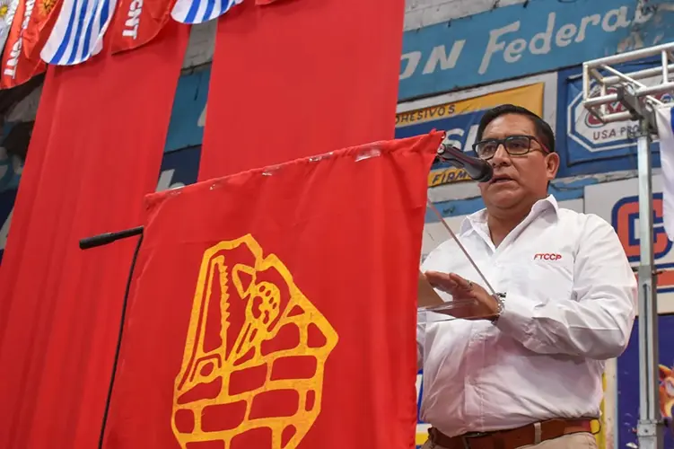 En representación de la FTCCP, el secretario de Economía, Félix Rosales, presentó el saludo institucional de la Federación al Congreso y entregó un presente, que simboliza la tradición constructora del Perú, al secretario general del SUNCA, Javier Díaz.